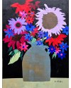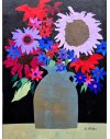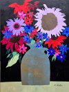 In this design, I used sunflower shapes and coneflowers but used artistic license with the colors. The vase is part of my collection of still life objects. Many of them have showed up in my artwork. They are like old friends.