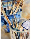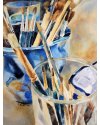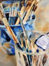 Painting still lifes inspires me, especially the elements I chose because of the shapes and colors and their relationships with each other. This painting is a series I began in 2006 which includes the elements of glassware, paint brushes and pots.